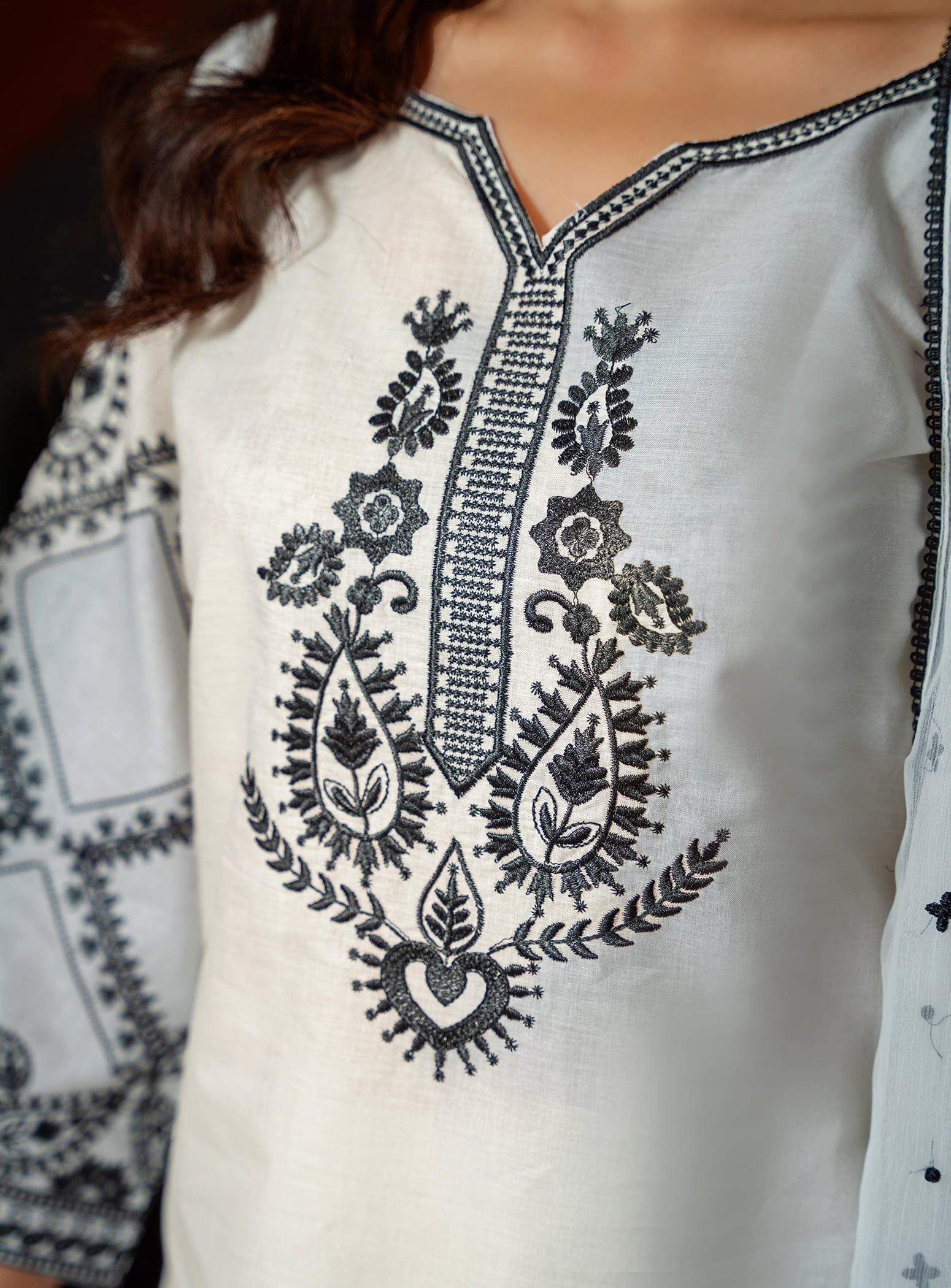Designed in crisp cotton fabric, this stunning set features a beautifully embroidered long kurta paired with sleek straight trousers. The look is completed with a lightweight chiffon dupatta, making it the perfect summer outfit for daily wear. Fresh, graceful, and effortlessly chic – Ayra White is your go-to for refined summer style.