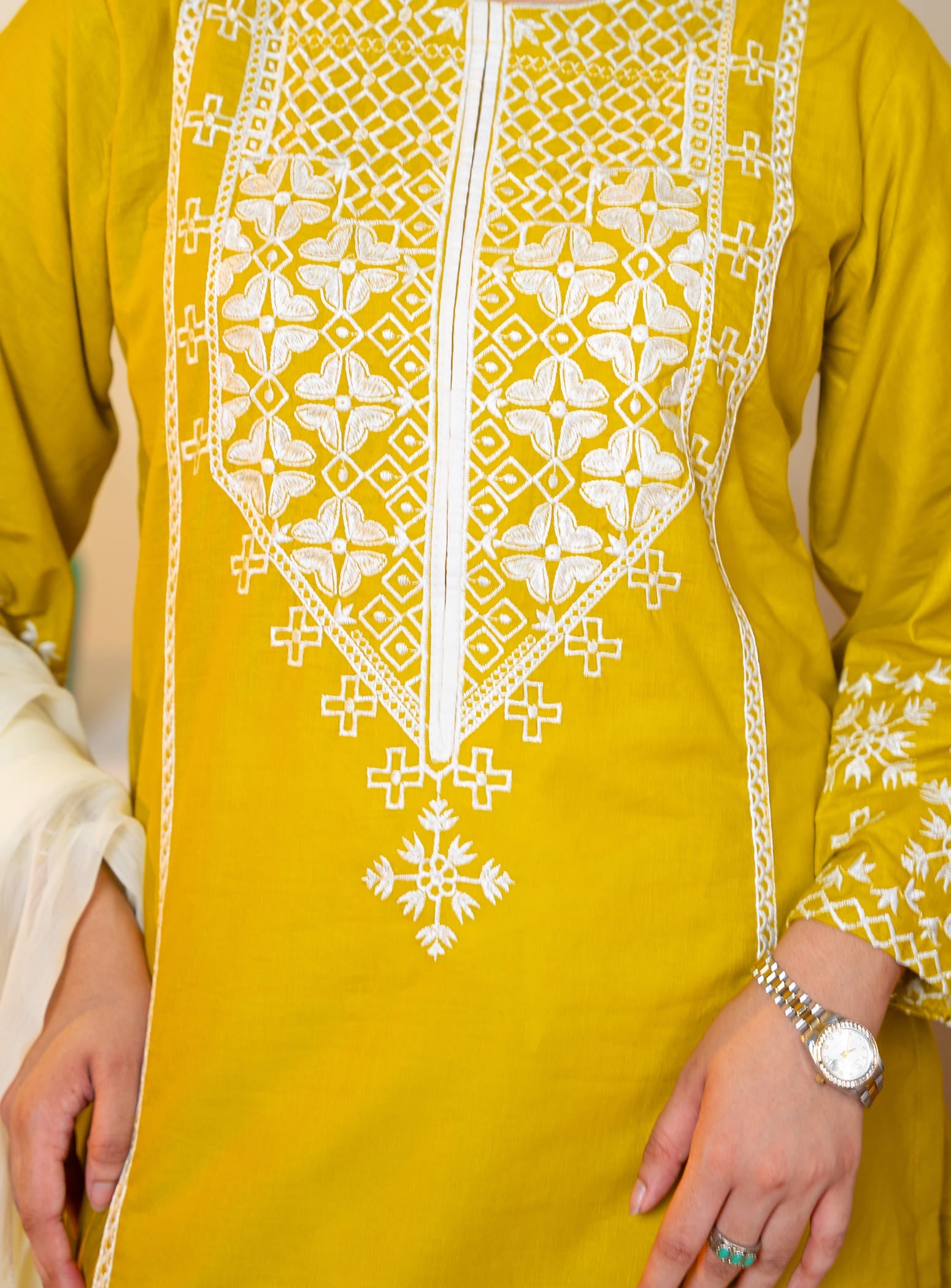 Made from breathable cotton fabric, this set includes a beautifully embroidered long kurta, paired with a comfortable straight trouser and a soft matching dupatta. Designed with an attached lining for a polished look, this outfit is perfect for daily summer wear – chic, light, and elegant.
